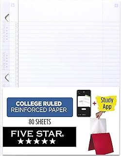 Five Star Loose Leaf Paper + Study App, College Ruled Filler Notebook Paper, Reinforced, Fights Ink Bleed, 8-1/2″ x 11″, 80 Sheets (170102)